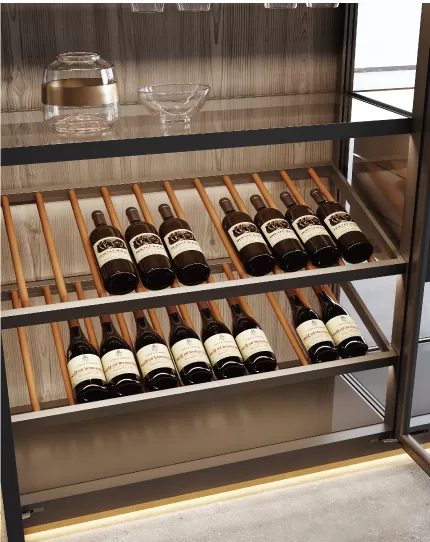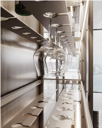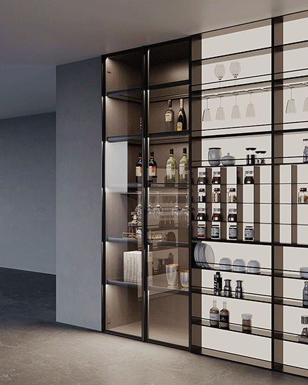 The combination design of open type and glass cabinet doors, meets the aesthetic requirements while increasing transparency, adding a sense of layer to the space. Interpreting the complementarity between parts and the whole with a light luxurious approach, integrating the wine cabinet and dining side cabinet into one, increasing functionality and enriching the fun of the space. The symmetrical layout has a clear hierarchy, coupled with embedded lighting, creating a pure sense of detail in daily life.