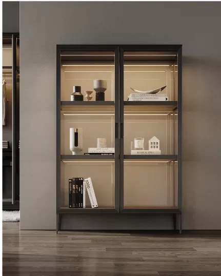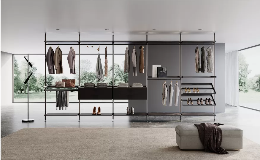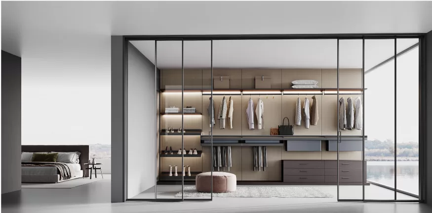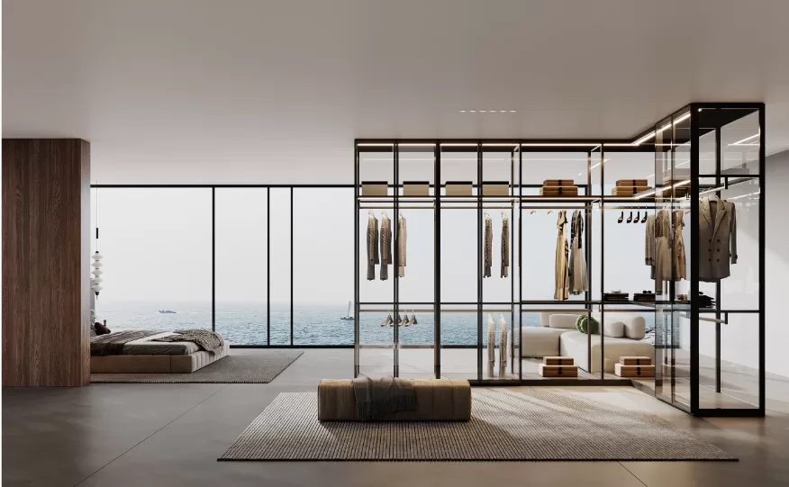 Abandoning traditional wardrobe forms and focusing on aluminum framed glass cabinets, with a 360 ° fully transparent glass design and a 360 ° fully transparent design combined with intelligent lighting systems. The combination of multiple groups of modules can meet the multi-functional use, can be matched with a variety of storage function parts, to provide comprehensive and display storage solutions for modern elites. The glass cabinet door plays the role of dustproof and transparent, and clearly displays the hanging area, stacking area and jewelry storage area one by one, which enhances its visual expression and gives the appearance a rich sense of layer.