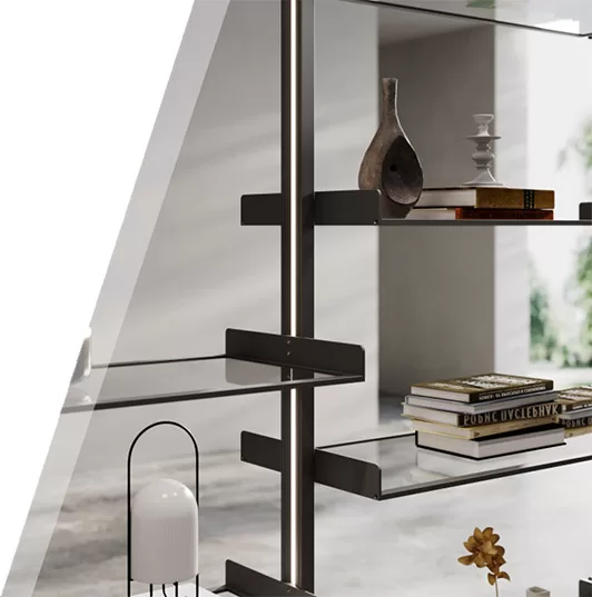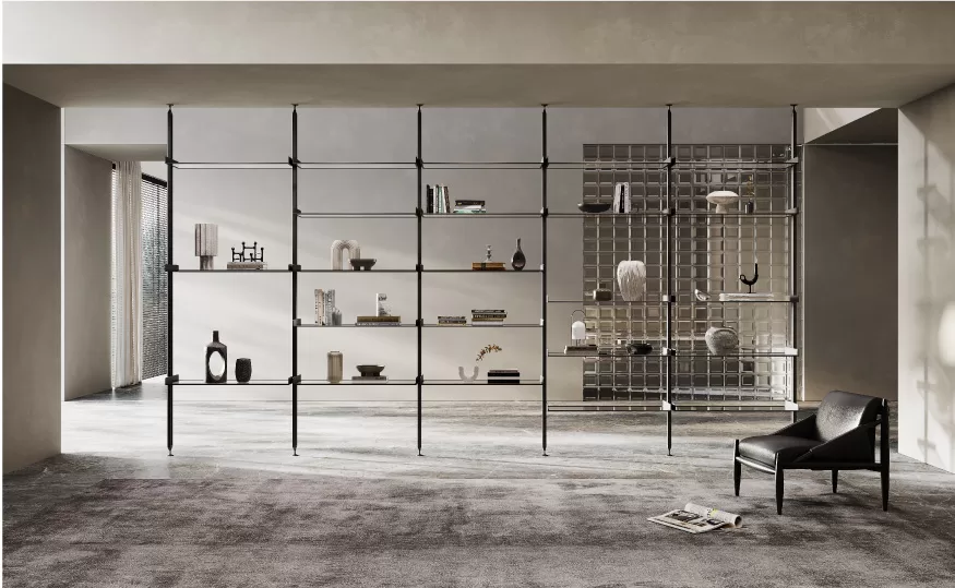 This column bookshelf partition, adopting aluminum alloy top and bottom columns, transparent glass laminate with champagne gold metal frame, it is both simple and noble, laminate can be adjusted according to individual needs. The height, length, and color of the cabinet, can be adjusted according to the actual size of the space,Suitable for matching different scenes and styles, this minimalist yet elegant column bookshelf, you also deserve it.