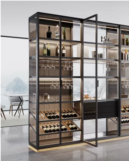 This glass wine cabinet, adopts an aluminum profile and full glass design, with a champagne gold frame and transparent glass door panel, highlighting nobility. It not only meets the pursuit of high beauty for contemporary young people, but also showcases the product’s expressive power. It is equipped with two luminescent layers and two wine rack layers, allowing the wine glass and wine to be stored at will. Combined with the lighting inside the cabinet, the entire wine cabinet becomes luxurious, making the entire space rich and interesting. This glass wine cabinet, you deserve it.