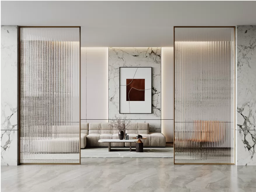 Our screen features mocha brown extremely narrow frame paired with ultra-high tempered wire glass, the artistic sense directly fills up, quiet and profound, adding a touch of mystery to the cloakroom, like a blind box, let you can’t wait to open it, ultra high tempered glass, simple, beautiful, and easy to clean, color and size can be based on personal preferences and space size tailored.