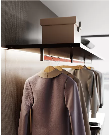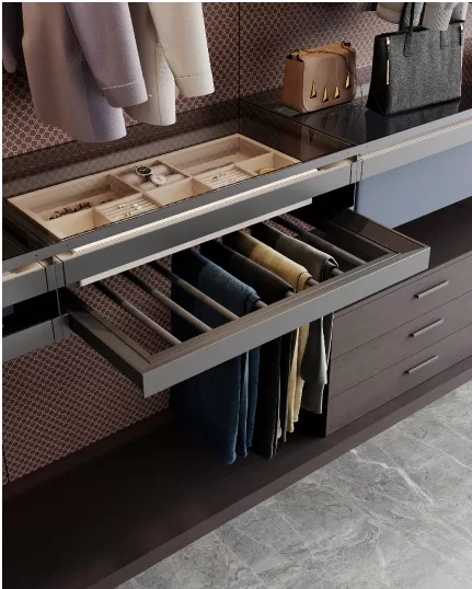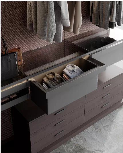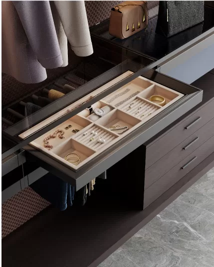 High quality fluorocarbon coating, super strong anti-corrosion, wear-resistant, scratch resistant, leather core, partition, and proper care of accessories. High quality leather core for exquisite partition storage, creating a refined lifestyle. Large R-angle design to protect clothing from harm. Heidi’s silent damping guide rail ensures smooth pushing and pulling