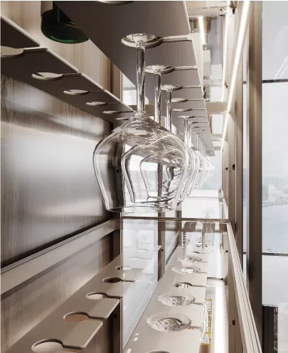 The whole cabinet adopts aluminum alloy structure design, transparent glass door assisted with built-in handle and universal door hinge, style simple and elegant, 900mm cabinet height plus single layer of glass, you can put your favorite cutlery willfully, under the illumination of the light, the atmosphere is instantly filled, this design do you like ?
