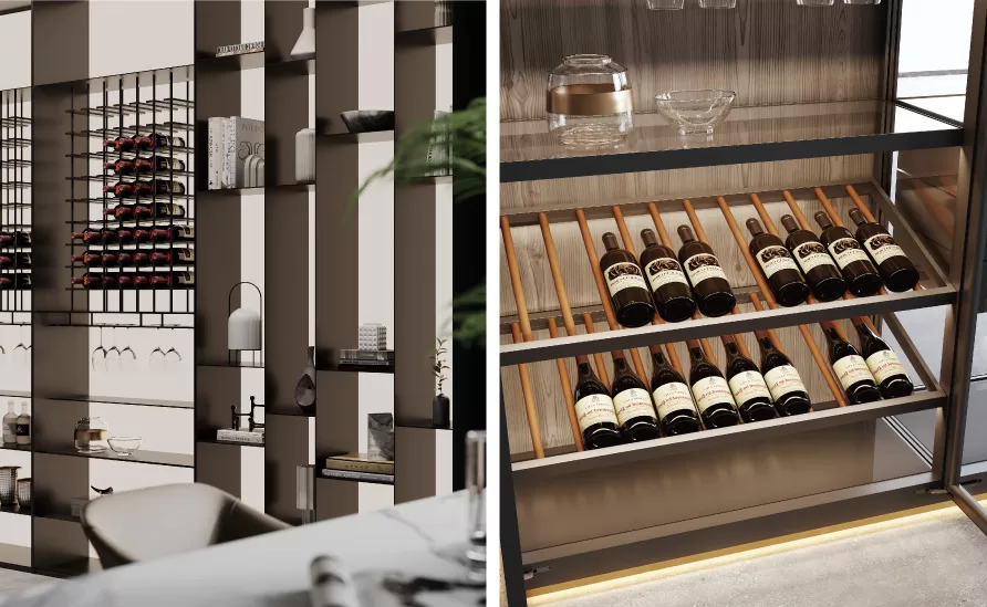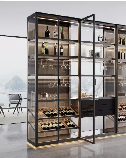 This glass wine cabinet adopts an aluminum profile and full glass design,with a champagne gold frame and transparent glass door panel, highlighting nobility. It not only meets the