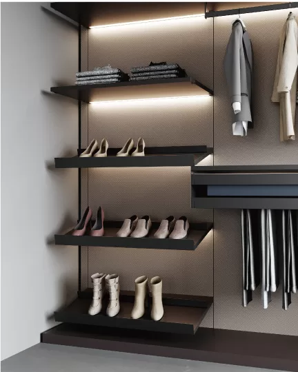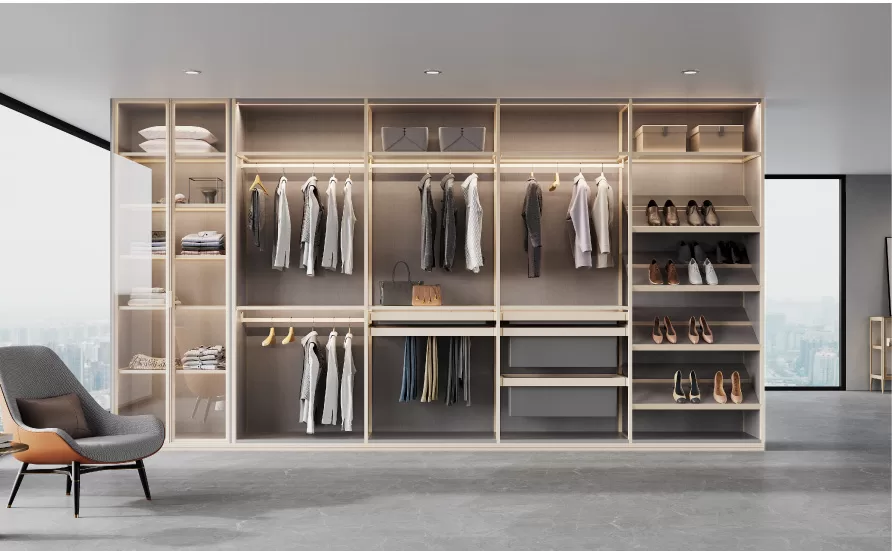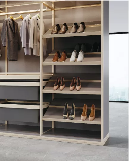 What does a beloved cloakroom look like? Let me take you to learn about the Jinluoka aluminum wood wardrobe. The gold aluminum frame surface is finely brushed, paired with a wood grain color back panel, making the entire cloakroom shine. The open layout and multi-dimensional display method, whether it is the storage of treasures or the placement of exquisite items, are all the best love for life. This multifunctional aluminum wooden garment integrates functions such as wardrobe, bookcase, drawer, shoe cabinet, etc.