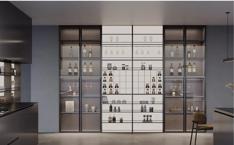 Heightened cabinets fit smaller kitchens, freeing up more space for food and cutlery storage. This set of high kitchen cabinets is designed with a combination of needle hinged glass doors and metal seasoning racks. Both sides are decorated with metal glass cabinets and a metal seasoning rack in the middle, paired with a luminous back panel, making the entire space brighter and more transparent. With an open layout and refined storage methods, the messy bottles and jars are instantly organized, and the height can be selected within 2700mm.