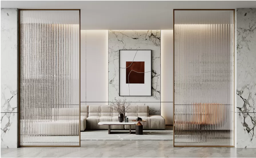 Our screen features a mocha brown extremely narrow frame paired with ultra-high tempered wire glass, light can be seen but person can’t be seen , quiet and profound, adding a bit of mystery to the cloakroom, like a blind box that you can’t wait to open. The ultra-high tempered glass is simple, beautiful and easy to clean, and the color and size can be customized according to personal preference and space size.